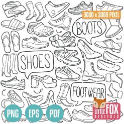 SHOES Doodle Clipart Icons. Footwear Clothes Bundle Scrapbook. Type of Boots Set Hand Drawn. Fashion Line Art Design Set Artwork Coloring.
